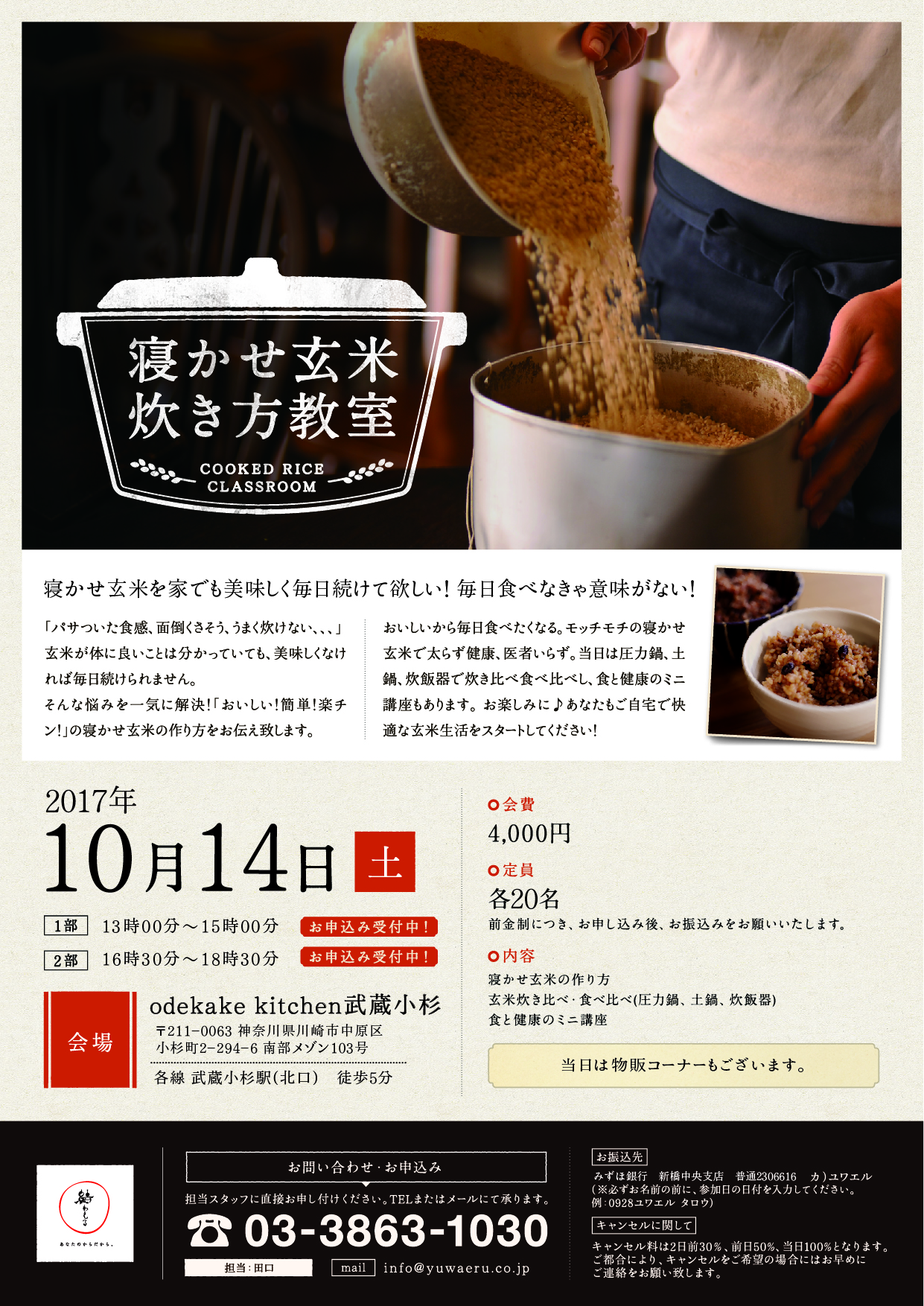 2017年10月度の『寝かせ玄米炊き方教室@武蔵小杉(神奈川)』→ 満員御礼!締め切りました。
