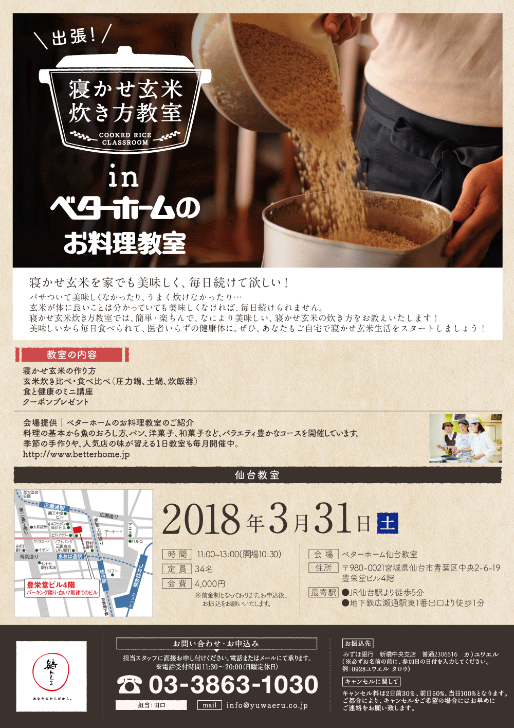 2018年3月、「ベターホームのお料理教室」にて『出張!寝かせ玄米炊き方教室』を開催いたします!-満員御礼〆締め切りました!