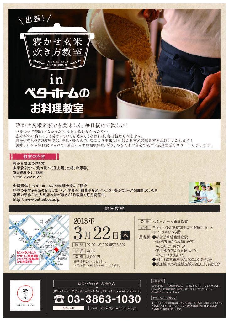 2018年3月『出張!寝かせ玄米炊き方教室inベターホームのお料理教室』銀座・仙台-満員御礼〆締め切りました!