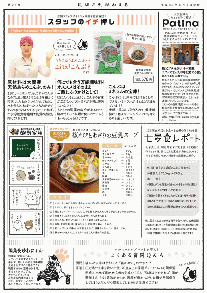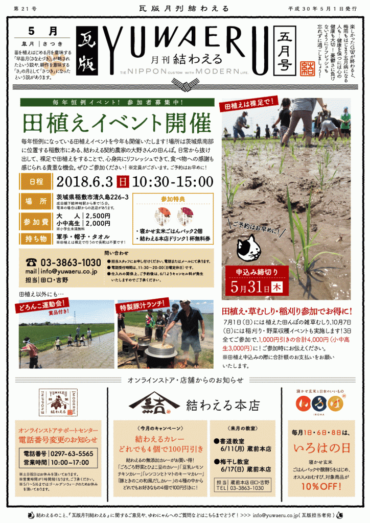 月間結わえる瓦版は結わえる本店、いろは店舗で配布、結わえるオンラインストアからはお届けのお荷物に同梱してお届けしております。