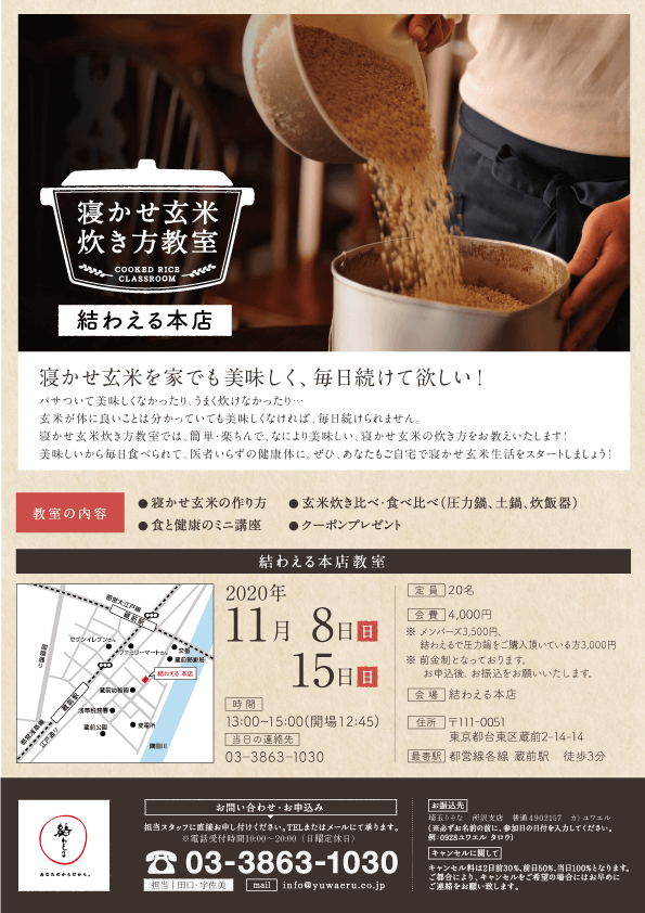 | 会費 | 4,000円 (メンバーズ3,500円、結わえるで圧力鍋を ご購入頂いている方3,000円) ◎前金制につき、お申し込み後、 お振込みをお願いいたします。 ◎当イベントは、寝かせ玄米アンバサダーの方も通常価格4000円となります。
