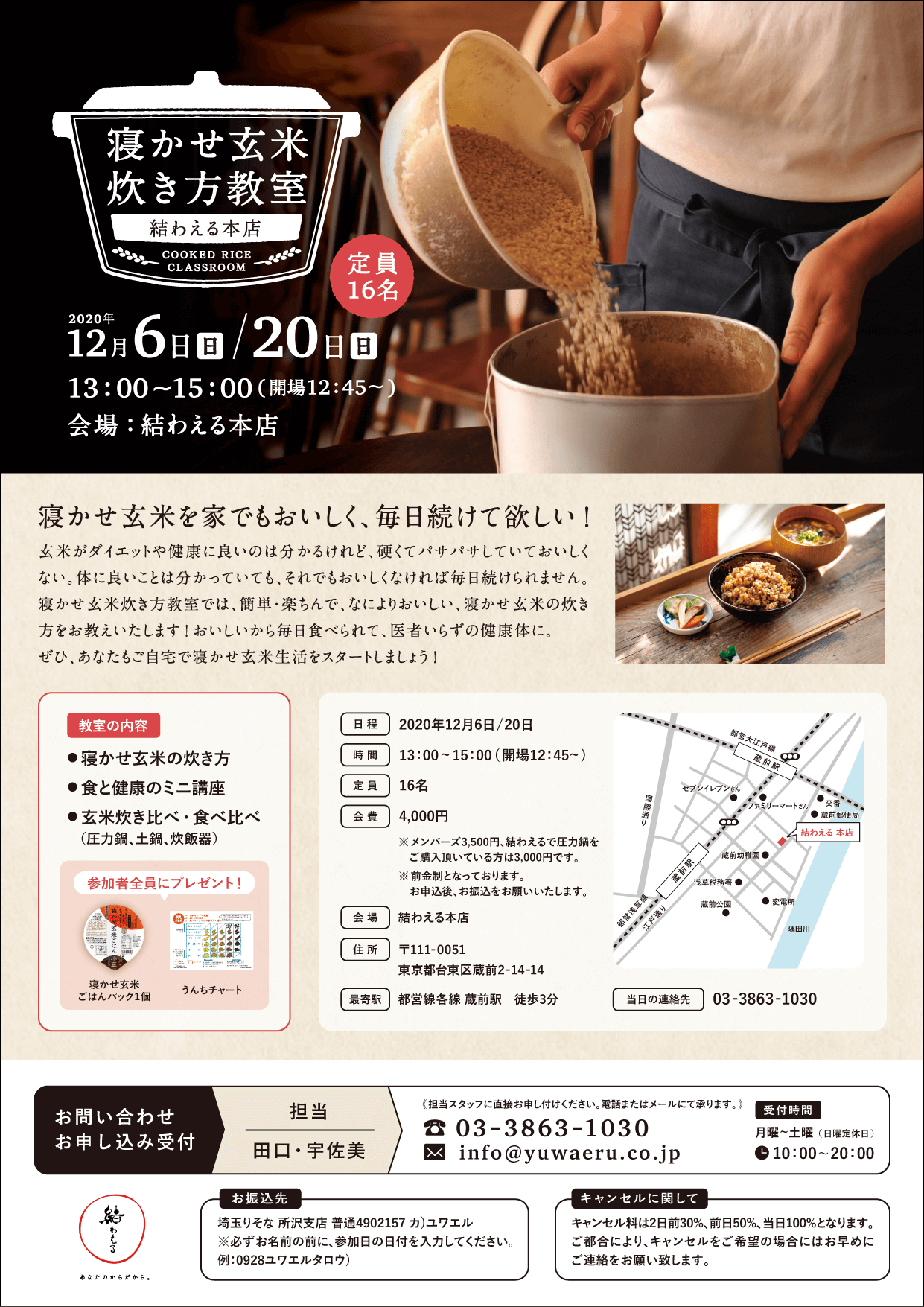 | 会費 | 4,000円 (メンバーズ3,500円、結わえるで圧力鍋を ご購入頂いている方3,000円) ◎前金制につき、お申し込み後、 お振込みをお願いいたします。 ◎当イベントは、寝かせ玄米アンバサダーの方も通常価格4000円となります。