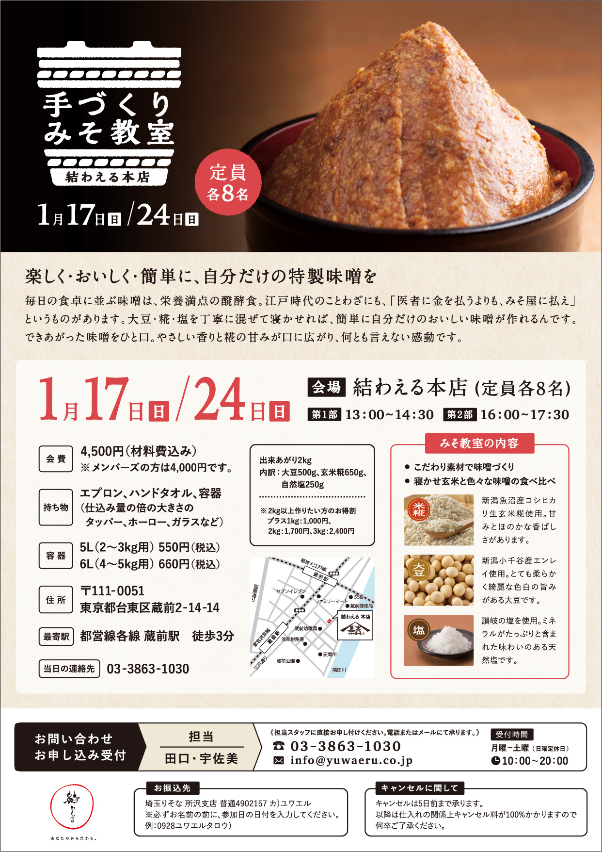 江戸時代のことわざにも、「医者に金を払うよりも、みそ屋に払え」というものがあります。大豆・糀・塩を丁寧に混ぜて寝かせれば、簡単に自分だけのおいしい味噌が作れるんです。できあがった味噌をひと口。やさしい香りと糀の甘みが口に広がり、何とも言えない感動です。ぜひ、奮ってご参加ください。
