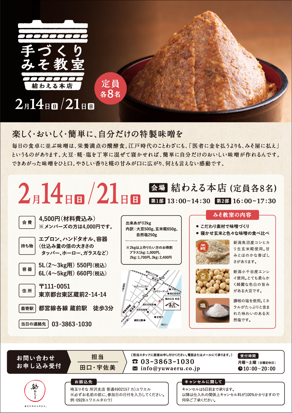 江戸時代のことわざにも、「医者に金を払うよりも、みそ屋に払え」というものがあります。大豆・糀・塩を丁寧に混ぜて寝かせれば、簡単に自分だけのおいしい味噌が作れるんです。できあがった味噌をひと口。やさしい香りと糀の甘みが口に広がり、何とも言えない感動です。ぜひ、奮ってご参加ください。